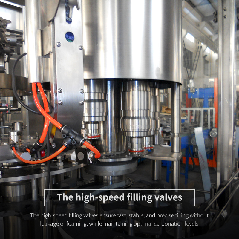 3、The high-speed filling valves ensure fast, stable, and precise filling without leakage or foaming, while maintaining optimal carbonation levels.