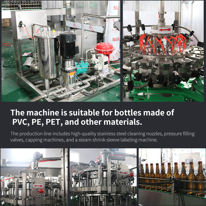 The filling system employs the isobaric (pressure-equalizing) filling principle, ensuring fast and stable operation, precise liquid levels, and sufficient carbonation. Compared to similar equipment, our product offers higher production capacity, stable and safe operation, low failure rates, a high degree of automation, and cost-effectiveness.