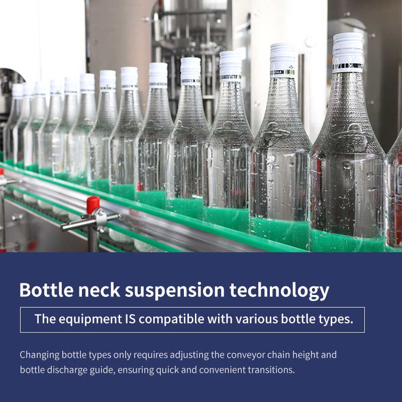 1、The machine adopts an advanced air conveyor bottle feeding system and utilizes a neck-handling transport mechanism, enabling quick and easy bottle format changeovers, significantly improving online efficiency.