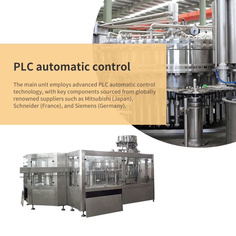 The entire machine is controlled by a high-quality programmable logic controller (PLC) for automated operation. The bottle conveyor system uses a variable frequency drive (VFD) for speed adjustment, enhancing stability and reliability. Each section is monitored by photoelectric sensors, further improving automation and ease of operation.