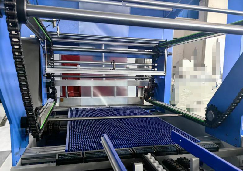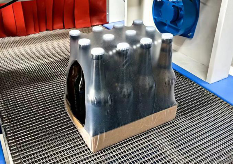 ●Bottle hander film wrapping: via bottle handing pole control each group bottle movement distance, let it synchronization with film lifting pole, and let bottle push to film wrapping section belt; film lifting pole and film lifting device match torsion limit stopper, while bottle drop or bottle block, limit stopper movement let machine auto stop, after failure solve, then turn limit stopper hand wheel reset.