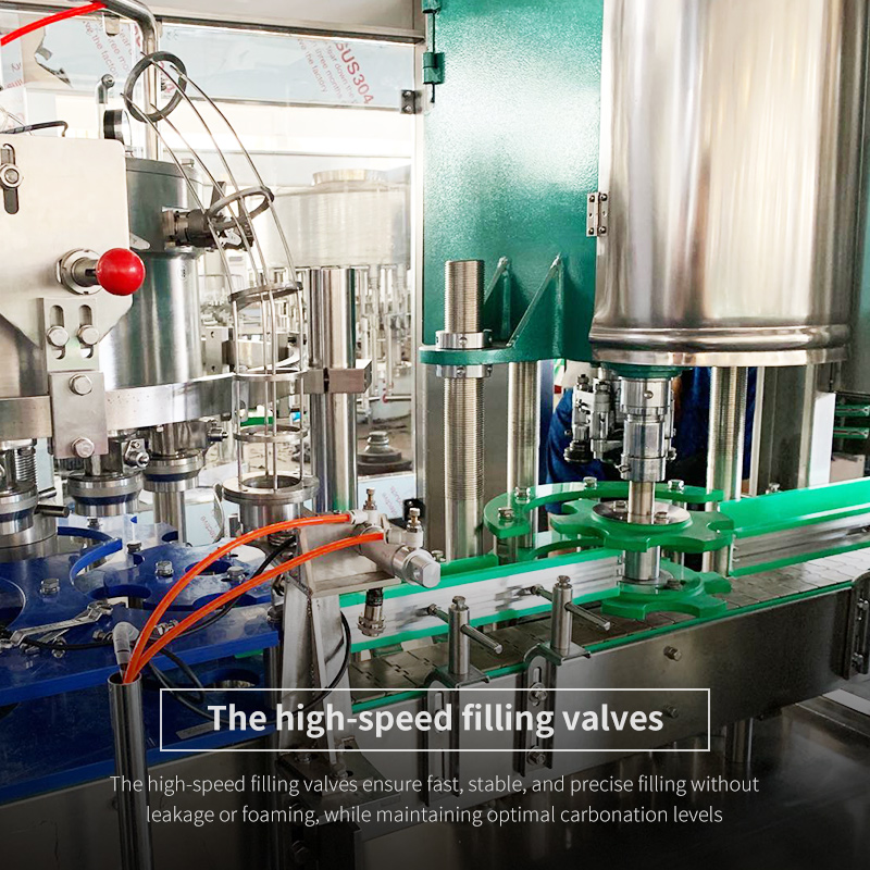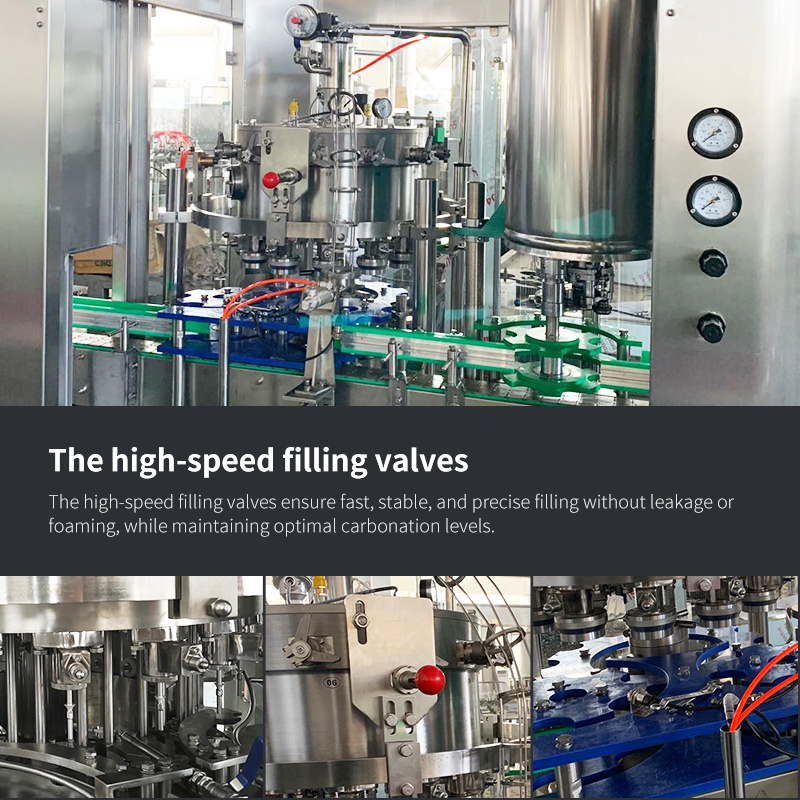 3、The high-speed filling valves ensure fast, stable, and precise filling without leakage or foaming, while maintaining optimal carbonation levels.