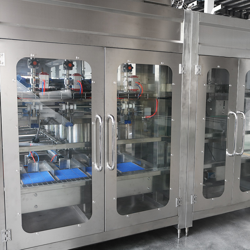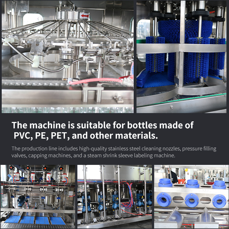 4、The production line includes high-quality stainless steel cleaning nozzles, pressure filling valves, capping machines, and a steam shrink sleeve labeling machine.