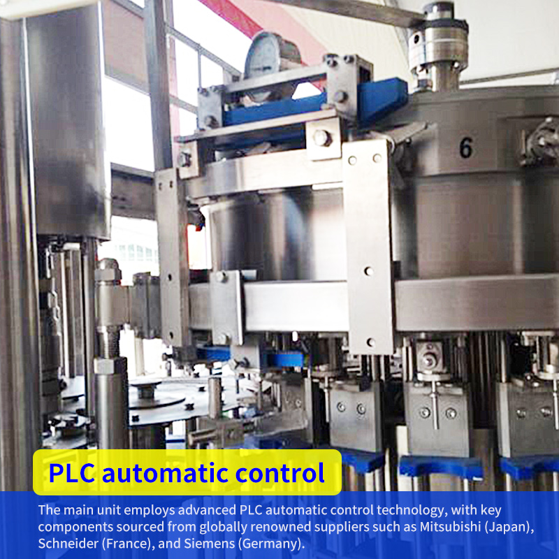 The entire machine is controlled by a high-quality programmable logic controller (PLC) for automated operation. The bottle conveyor system uses a variable frequency drive (VFD) for speed adjustment, enhancing stability and reliability. Each section is monitored by photoelectric sensors, further improving automation and ease of operation.