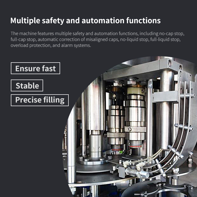 6、The machine features multiple safety and automation functions, including no-cap stop, full-cap stop, automatic correction of misaligned caps, no-liquid stop, full-liquid stop, overload protection, and alarm systems.