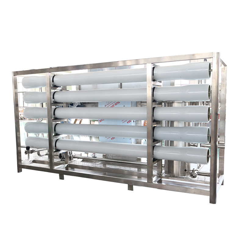 The RO unit purifies water by utilizing the pressure difference across a semi-permeable membrane. Operating at a pressure higher than the osmotic pressure, it allows only water molecules to pass while blocking dissolved salts (removing 97%), colloids (99%+), microorganisms, and organic matter. This system offers high water quality, low energy consumption, zero pollution, simple process, and easy operation, making it the ideal choice for producing purified, high-purity, and ultra-pure water.