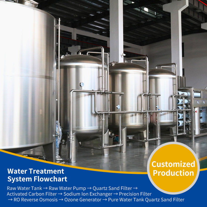Raw Water Tank → Raw Water Pump → Quartz Sand Filter → Activated Carbon Filter → Sodium Ion Exchanger → Precision Filter → RO Reverse Osmosis → Ozone Generator → Pure Water Tank