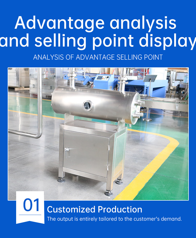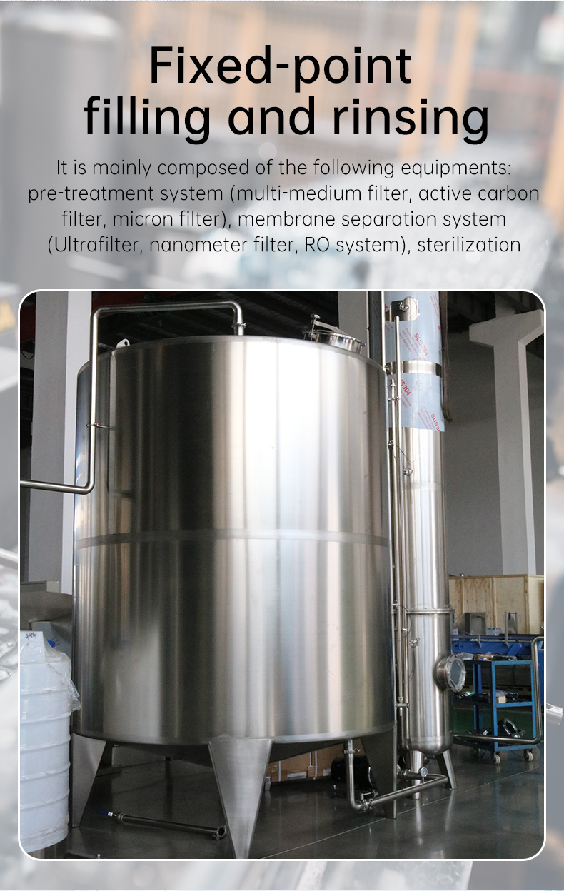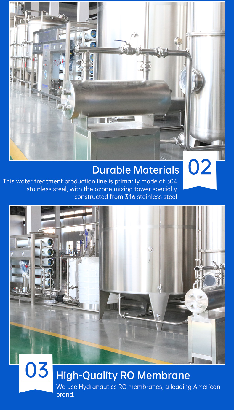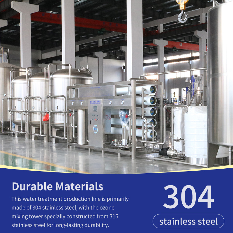 This water treatment production line is primarily made of 304 stainless steel, with the ozone mixing tower specially constructed from 316 stainless steel for long-lasting durability.