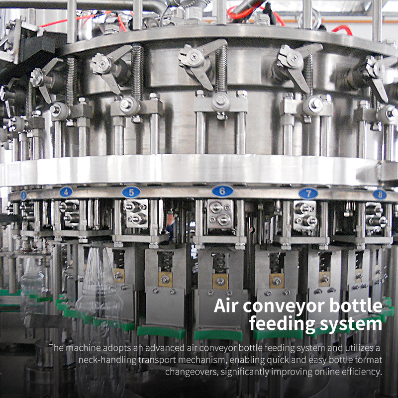 1、The machine adopts an advanced air conveyor bottle feeding system and utilizes a neck-handling transport mechanism, enabling quick and easy bottle format changeovers, significantly improving online efficiency.