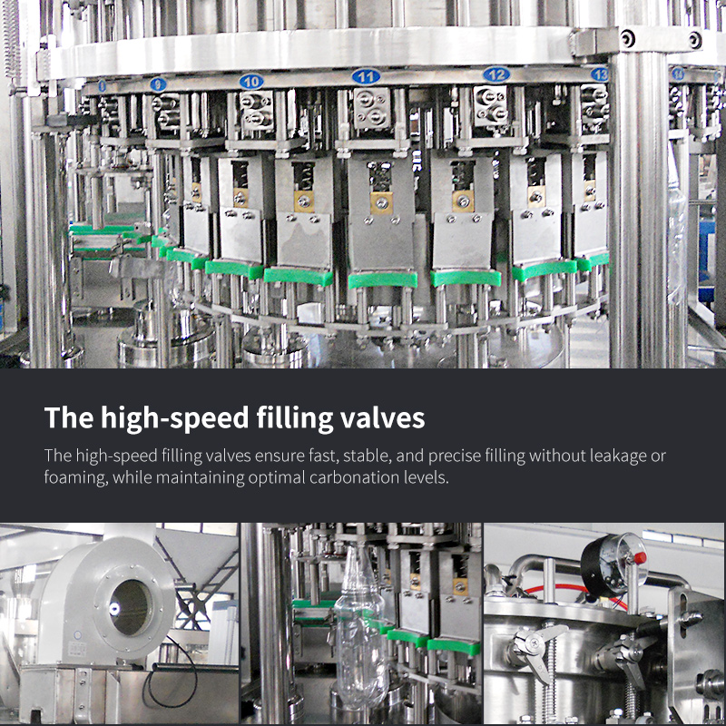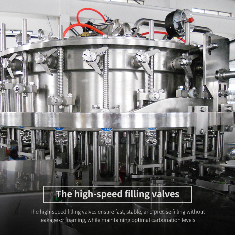 3、The high-speed filling valves ensure fast, stable, and precise filling without leakage or foaming, while maintaining optimal carbonation levels.